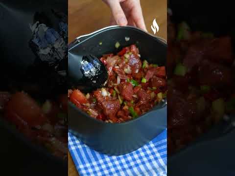 Airfryer haznesine kuşbaşı etlerimizi, doğranmış biberleri, soğanı ve domatesi, domates salçasını, pul biber, karabiber ve tuzu, sıvı yağı ekleyerek tüm malzemeyi güzelce karıştıralım.